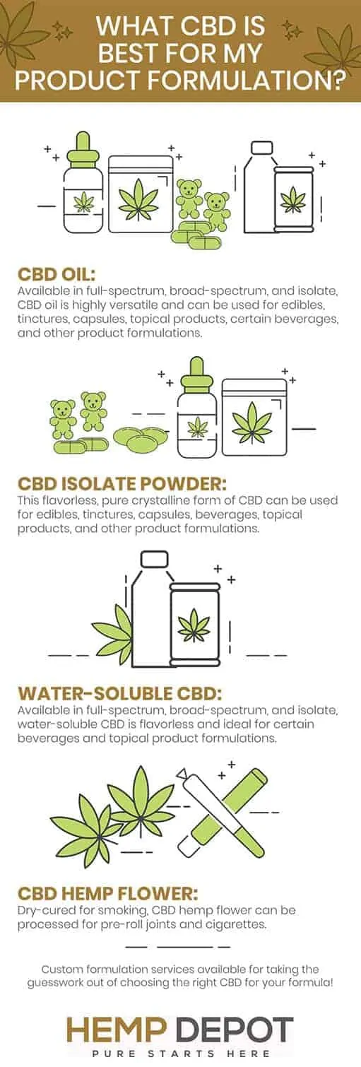 Are you the owner of a startup business that’s launching your own CBD product line? Are you looking for a way to expand your current offerings and reach more customers? Hemp Depot is here to help you succeed! We can formulate and manufacture CBD products that align with your company’s brand and mission. When you partner with us, you can choose from a variety of terpene profiles, flavors, delivery methods, and customization options for your custom-formulated CBD products.